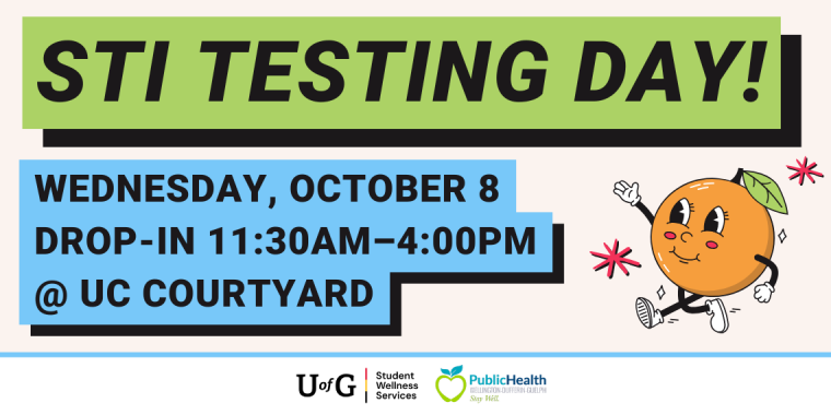 U of G Health Services STI Drop-in Testing clinics Mon. & Tues. 1:30pm-4:00pm. Also available by appointment.